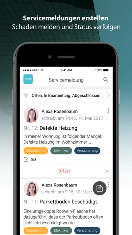 Profitieren Sie von der MWW App und melden Sie uns Ihre Anliegen und Schäden rund um die Uhr. Sie erhalten Status-Updates zu Ihren Meldungen und die gesamte Korrespondenz wird dokumentiert.