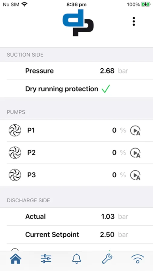 Via the App and an access code you can make a wireless connection with the DP-Control on DP-Pumps booster systems. The App gives you direct insight into the status of the pump system, the programmed parameters and allows you to operate the control and change settings directly.