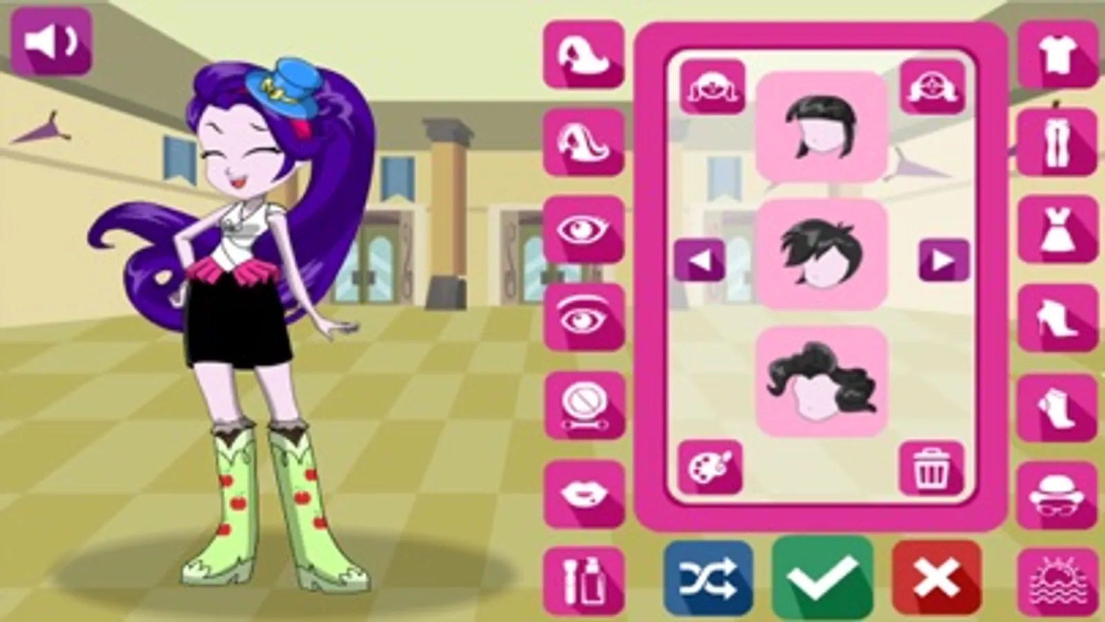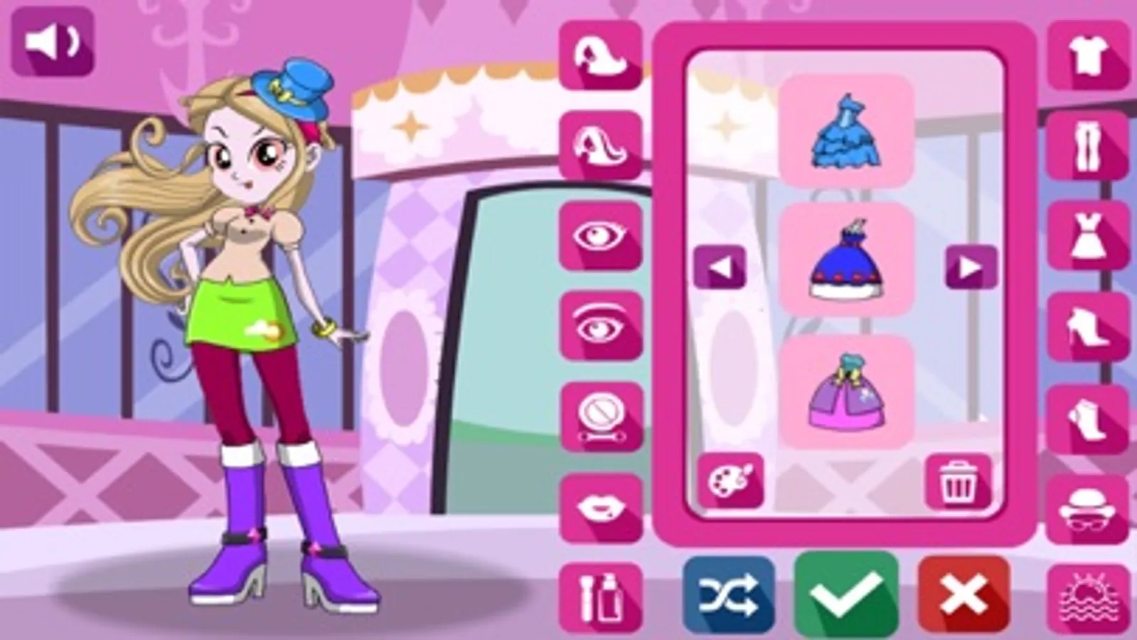 This games of princess pony girls avatar maker you can create already known and consecrated characters from the princess girls universe or create your totally original character the game has many combinations of hair eyes mouth eyebrows eye shadow skin color shirts pants skirts dresses shoes socks accessories and bottoms You can paint the hair of different colors and even add gradient Your new original character will be the way you want.