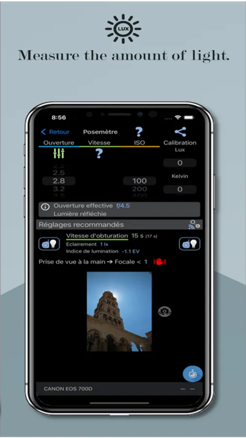 - Calculate the optimum settings according to the lighting of the place (Light Meter)