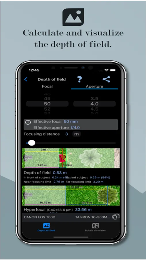 - Calculate the depth of field, hyperfocal and simulation of Bokeh