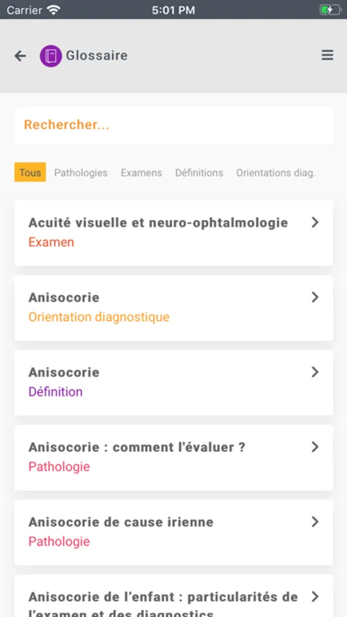 - l’onglet « Glossaire » permet de faire une recherche par mot(s)-clé(s), mais également d’obtenir des définitions et plus globalement, de retrouver l’ensemble des fiches disponibles dans l’application.