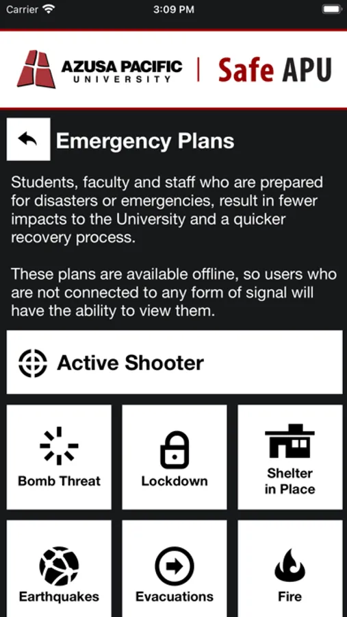- Emergency Plans: Campus emergency documentation that can prepare you for disasters or emergencies. This can be accessed even when users aren’t connected to Wi-Fi or cellular data.