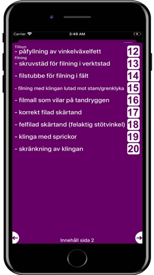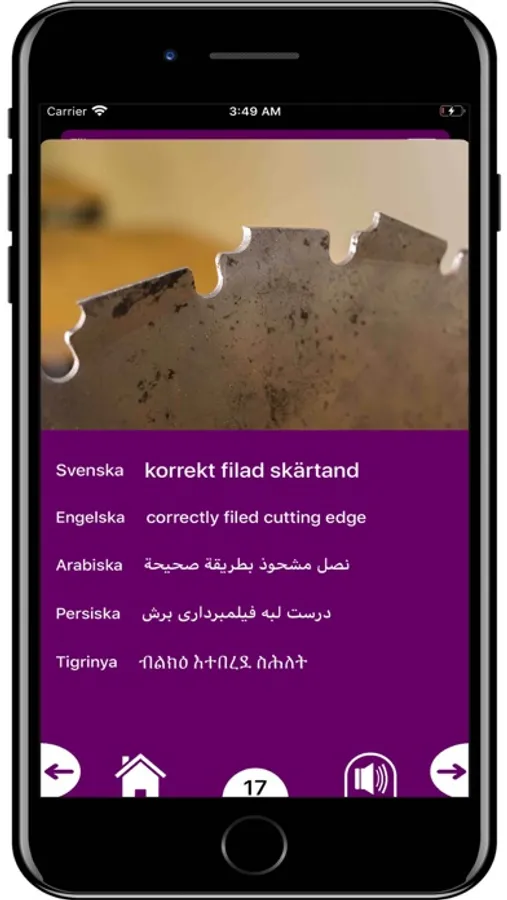 Denna ordbok beskriver med ord och bild röjsågens verktyg & tillsyn filning av röjklinga. Orden finns i skrift på svenska, engelska, arabiska, persiska och tigrinja och med ljud på svenska.