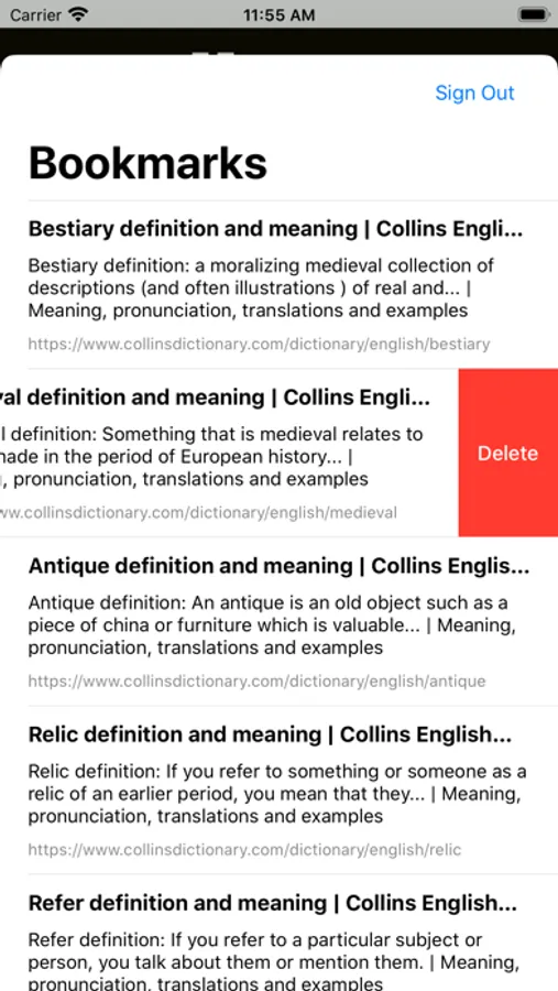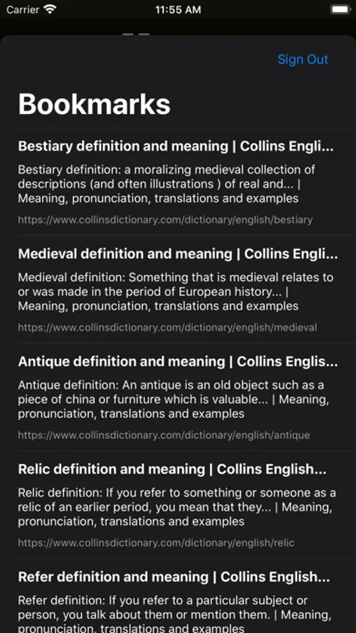 This is the simplest app to see Collins Dictionary with a bookmark feature. In my experience in language school London, the Collins dictionary was a very useful site to find a good explains and pronunciation and synonyms for new words even if you want to learn about grammars.
