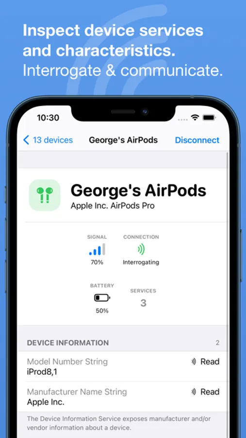 Constant use of Bluetooth connectivity can drain your device's battery. Bluetooth connectivity is only used when this app is in the foreground and up to a few seconds after being backgrounded to safely disconnect from peripherals being interrogated.