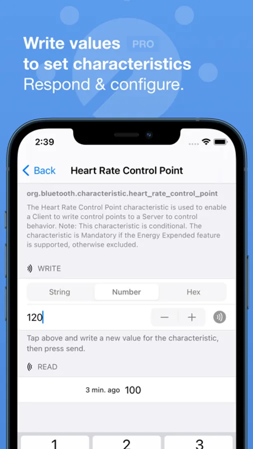 • Write characteristic values back to the peripheral as string, numeric or hex (pro).
