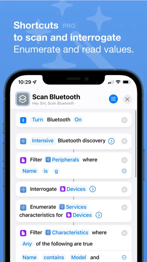 • Shortcuts integration with actions for scanning and interrogation, enumerating services and characteristics, and reading values (pro).