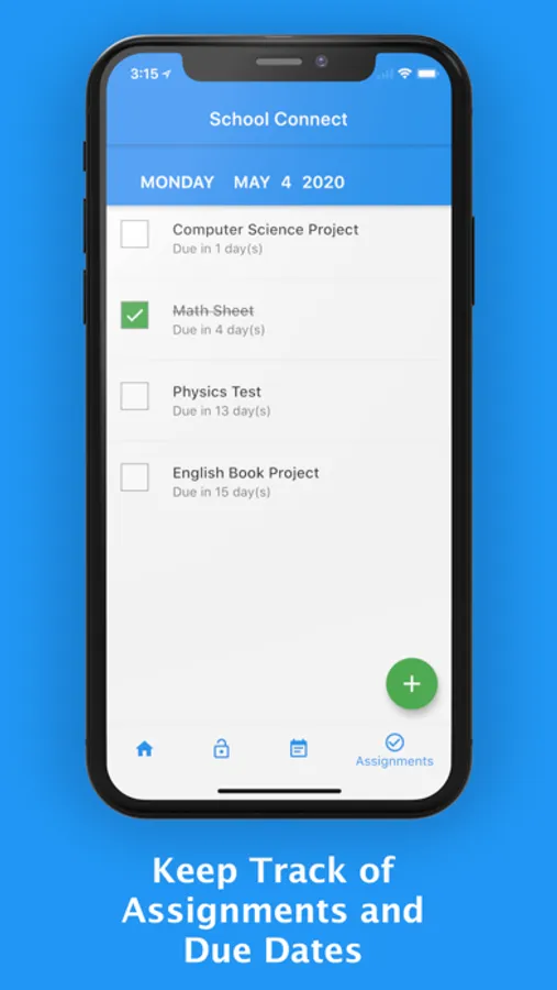 - Keep track of all assignments by order of due date and reminds you the day before its due