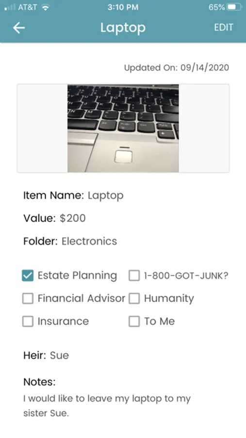 Manage My Things is a subscription based app ($9.99 per year, auto-renewing). This feature-rich but easy to use photo-based app helps you capture images of all the important things in your home, or that of your aging parents. The app helps you to organize each "thing" by category, it quizzes you for details such as which heir gets what or what each thing is worth. The app produces PDF inventory reports and sends them to whomever you select to help you complete an estate plan, ensure your things are properly insured, donate your hard goods to charity or dispose of anything unwanted. The app has a simple "batch" feature for capturing multiple images at once when time is short. A "Resolution" folder to isolate items in an estate that may have triggered family conflict. You have the ability to add more homes, boats, storage units or any place else you have things too manage. Data is stored locally within the app and a secure back-up is included in the annual subscription. Please see our Terms of Use here: https://managemythings.com/privacy-policy/
