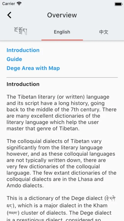 This dictionary is not intended to replace the literary language dictionaries. Its primary purpose is to aid non-native speakers of the Dege dialect to learn to speak this dialect. It uses the Tibetan script to write the language down, and the phonetic transcription and the recordings are there to aid the learner in pronouncing the words.