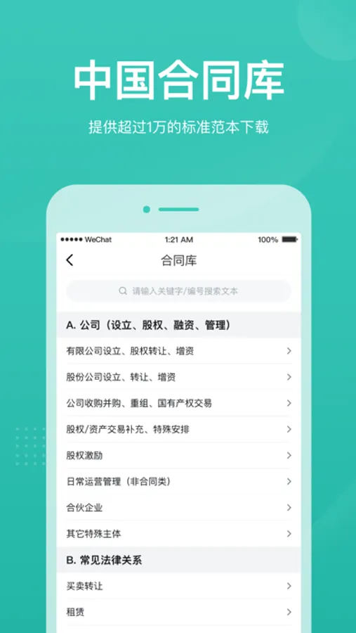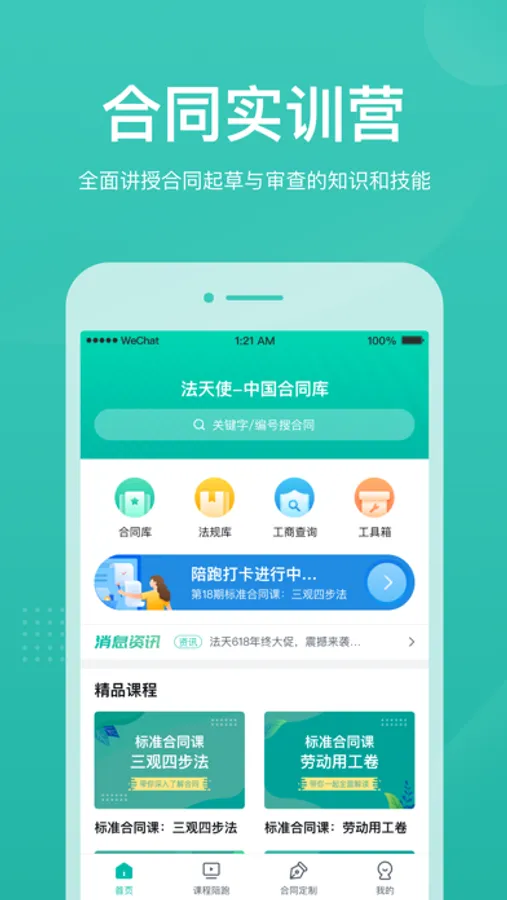 法天使官方APP,包含合同库、法规库、工商查询、工具箱和线上实训营等功能。