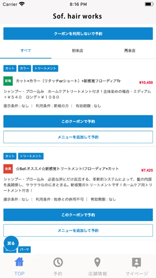 お得なクーポンが配信されます。ネット予約時にクーポン利用での予約も可能なので来店時もスムーズに施術頂けます。
