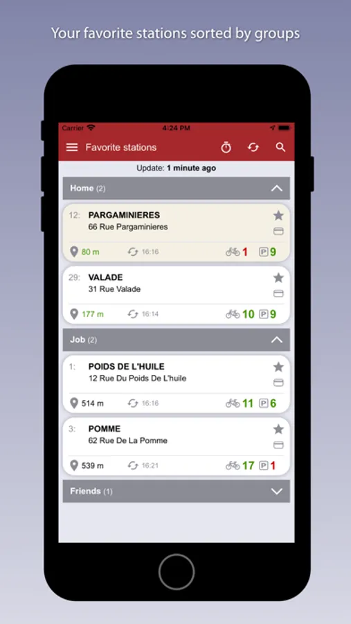- List of favorite stations categorized by groups (home, work, friends or general).