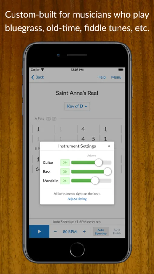 Practice all your songs with customizable backing tracks generated with audio from real instruments: guitar, mandolin, and standup bass.