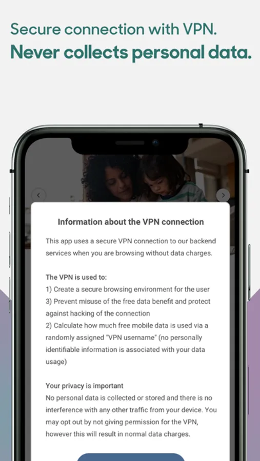 While the VPN enables a secure connection, no personal data is collected from the user and there is no interference with any other traffic from the device. All user traffic is respected and allowed and no data is collected or stored. A clear message is presented to the user informing them about the VPN.