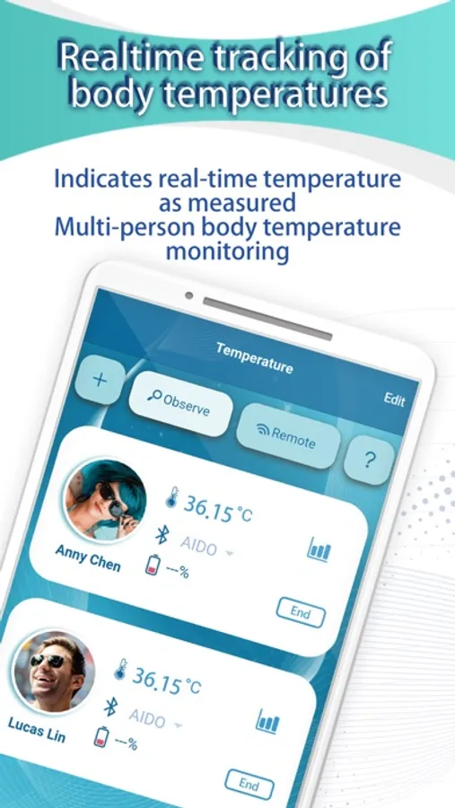 AIDO Temperature Monitor app paired with the AIDO Bluetooth Device, allows you to accurately monitor your, or someone else's, body temperature. It can also monitor multiple people's temperatures at the same time and alerts you when any recorded temperature is too high or too low, so you can conveniently care for family members or friends.