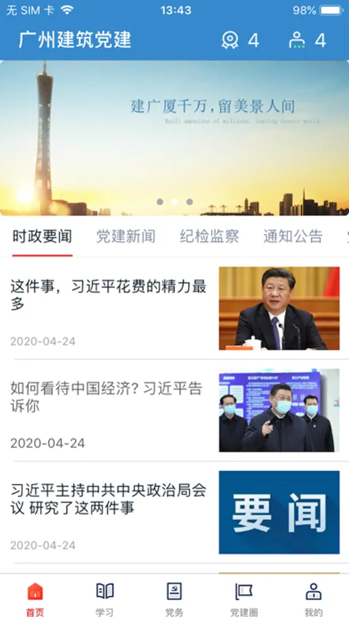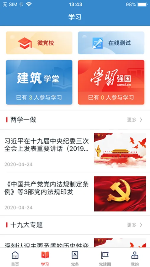党建要闻——管理后台自动抓取党政要闻,管理人员后台发布党建动态、组织动态等讯息。