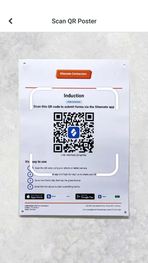 The Sitemate App's contactless signoff works via the scanning of a workers unique QR code, which can be scanned by any devices default camera to instantly stamp their signature and details onto any form or process - including toolbox talks, tailgate meetings, pre starts and method statements (RAMS / SWMS).