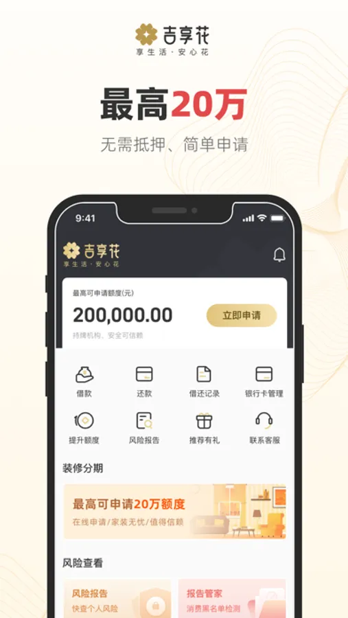 吉享花是绿地小贷旗下为用户提供便捷丰富的消费金融和生活服务平台,为您提供安全、专业、智能、便捷的分期消费贷款。