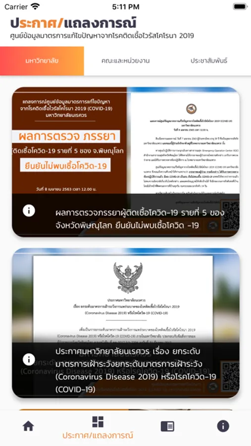 NU Know COVID-19 แอปพลิเคชัน โดยศูนย์ข้อมูลมาตรการแก้ไขปัญหาจากโรคติดเชื้อไวรัสโคโรนา 2019 (COVID-19) ม.นเรศวร แหล่งที่รวบรวมข่าวสาร และสถานการณ์ COVID-19 ในรั้วมหาวิทยาลัยนเรศวร สถิติผู้ป่วยติดเชื้อของ รพ.มหาวิทยาลัยนเรศวร และสถานการณ์ผู้ป่วยติดเชื้อภายประเทศไทย รวมถึงคลังความรู้ สำหรับนิสิต บุคลากร และประชาชนทั่วไป เพื่อป้องกันตนเองจาก COVID-19