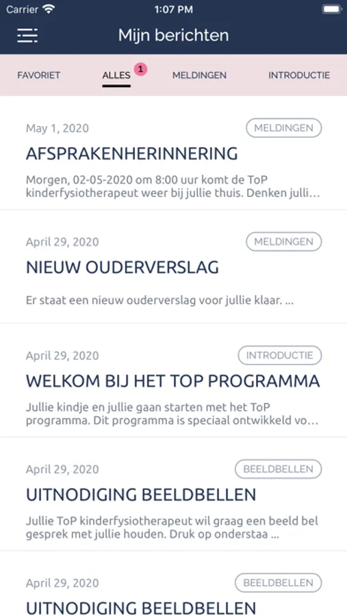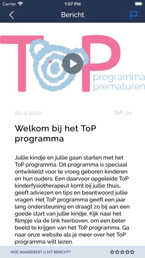 De TOP app is speciaal ingericht voor gebruik door ouders van te vroeg en/of te klein geboren kind(eren) die deelnemen aan het TOP programma. Zij kunnen daarin algemene informatie vinden over het TOP programma. De TOP kinderfysiotherapeut zorgt ervoor dat er ook persoonlijke informatie voor de ouders beschikbaar wordt gesteld, die met behulp van inloggen door ouders wordt verkregen. Middels push berichten wordt de ouder op de hoogte gesteld van nieuwe, beschikbare informatie. Zo maakt de TOP app informatie uitwisseling mogelijk met de juiste inhoud op het juiste moment.