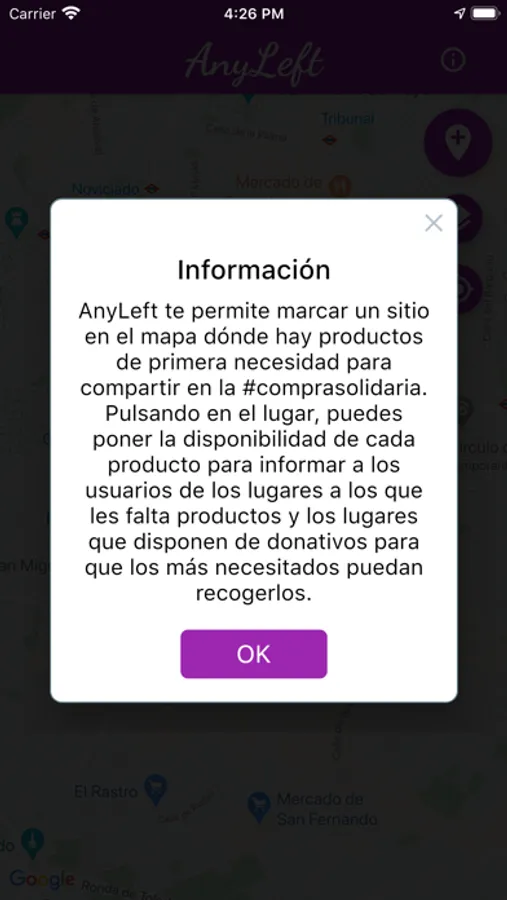 AnyLeft te permite marcar un sitio en el mapa donde hay productos de primera necesidad para compartir en la Compra Solidaria. Pueden ser desde alimentos hasta ropa, libros, juguetes, etc. Cualquier objeto que pueda ayudar a alguien necesitado.