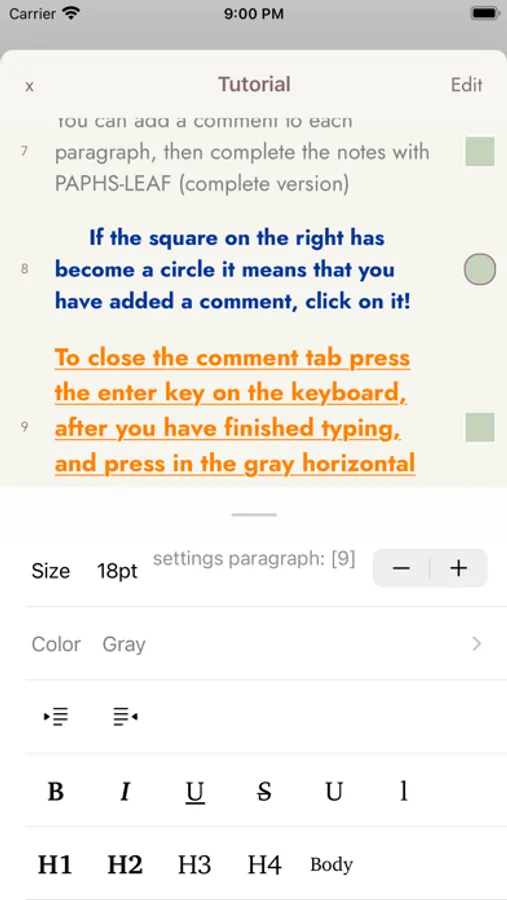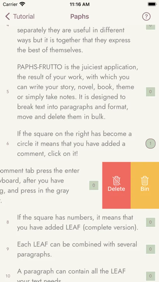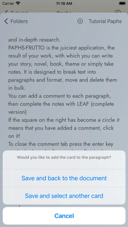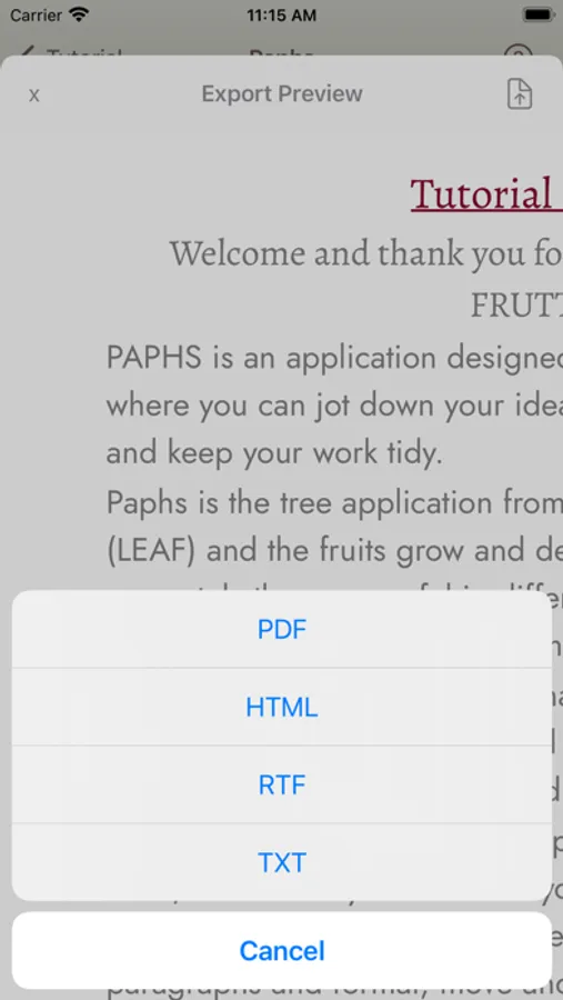 Paphs, the main app that combines Frutto and Leaf, the Tree, is where you can take advantage of the full features of the two apps together and their interaction, including exporting the document you created and more.