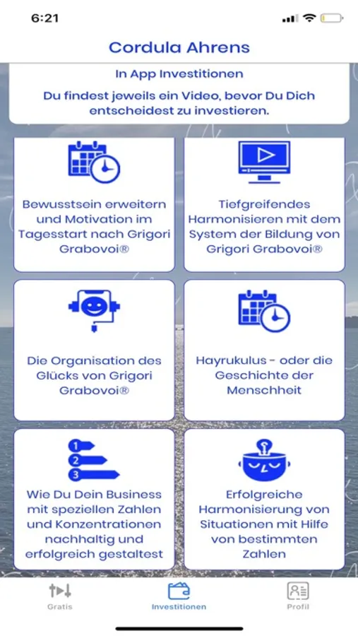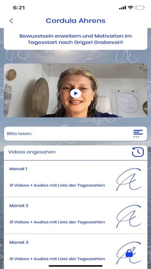 „Bewusstsein erweitern und Motivationen im Tagesstart“: 92 Videos/ Audios. Ein 3-Monats Kurs mit ausführlicher täglicher Anleitung für einen effektiven Start in einen harmonischen Tag. Genaue Anleitung zur effektiven Ziel Formulierung. Mit täglicher Push Mitteilung zur Erinnerung und Weiterleitung zu den passenden Videos. Für die ersten 3 Monate Aufbau: Investition in Dich: 49,80 € Ab dem 4. Monat: monatliche Investition in Dich: 4,98 € Bei Beendigung gibt es keinen Datenzugriff mehr.