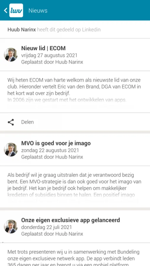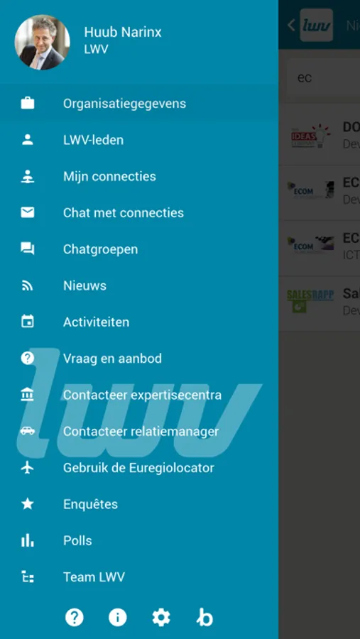 Met de LWV app kom je eenvoudig in contact met andere LWV-leden. Je kunt direct contact leggen via de chat waardoor je makkelijk je netwerk uitbreidt. Daarnaast blijf je met de app op de hoogte van het laatste nieuws en kun je je direct aanmelden voor evenementen en activiteiten. Contact met je relatiemanager of heb je een vraag aan één van onze expertisemanagers op het gebied van Arbeidsmarkt & Onderwijs, Duurzaamheid & Innovatie, Infrastructuur & Ruimte of Parkmanagement? Leg dan via de app direct contact. Ook de Euregiolocator is benaderbaar via de LWV app. Gebruik de app om alles uit je lidmaatschap te halen.
