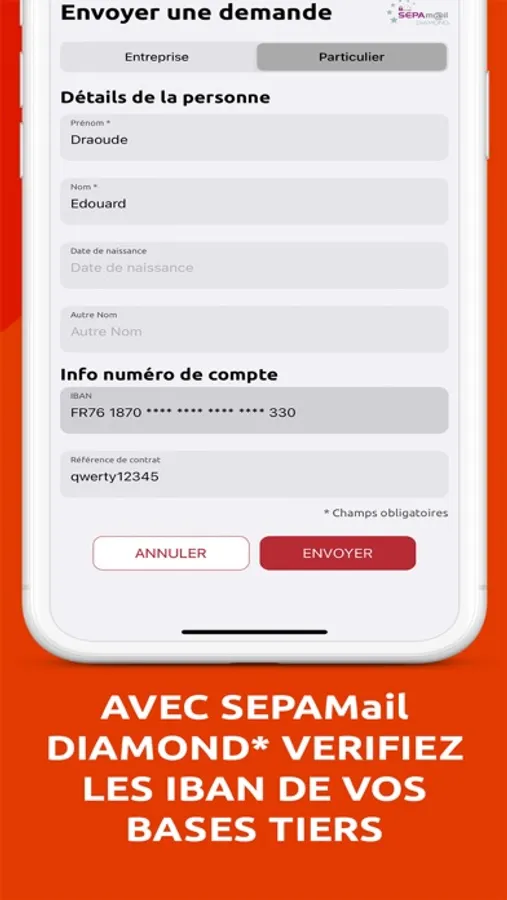 - Vérifier les coordonnées bancaires de vos nouveaux clients ou fournisseurs via le service SEPAmail DIAMOND*. Vous limitez ainsi les risques d'impayés et de fraude.
