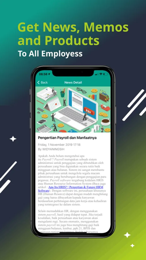 Em-HR Mobile Attendance memudahkan perusahaan untuk membuat berita/pengumuman kepada karyawannya.