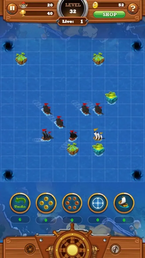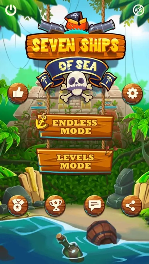 Seven ships battle - Pirates of sea is a top-down strategical arcade puzzle game with a pirate theme, a turn-based game, set on an ocean board of 11x11 squares. Players control a white galleon, boat and need to eliminate all pirate ships to complete a level. For each turn the ship can move in any of the eight squares surrounding the ship, unless blocked by an obstacle. Pirate ships have the same movement options and an identical speed of one square per turn. It is also possible not to move and fire the two broadside cannons to the left and the right of the ship instead, with a maximum reach of three squares.