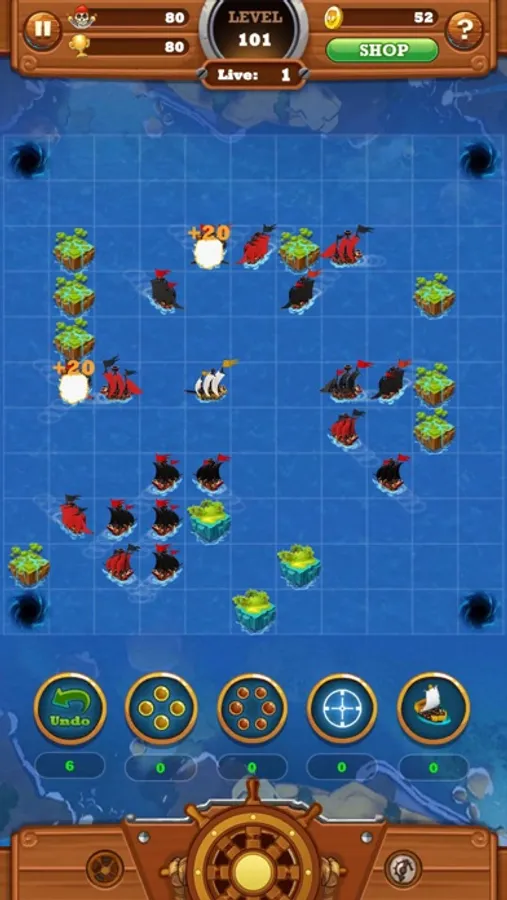 - The shop offers Strong cannons, escape charms,... you can use strong cannon to destroy pirates easily.
