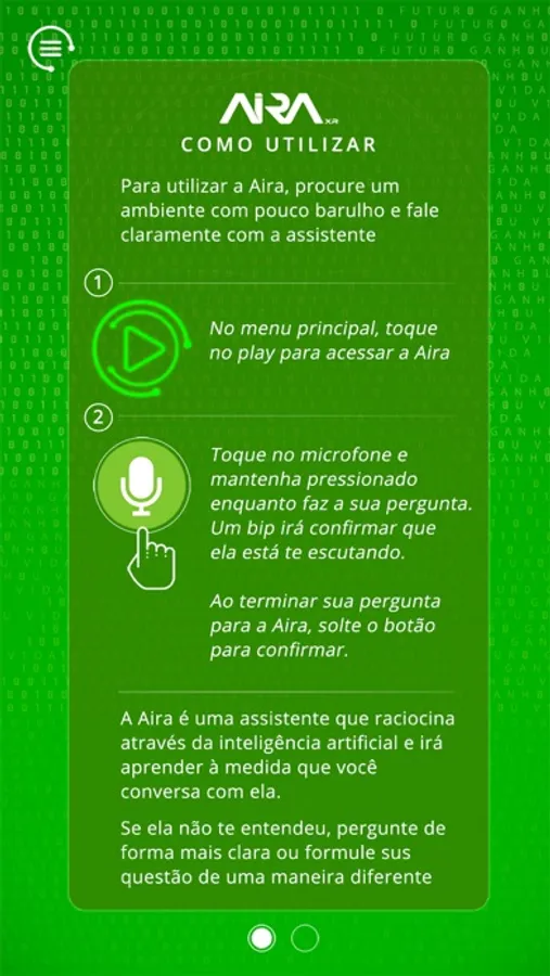 Para interagir, o usuário deverá pressionar o botão do microfone e fazer uma pergunta para a Aira. Todo o conteúdo é gerenciado por um painel de controle, permitindo ao gestor cadastrar perguntas e respostas e acessar as estatísticas referentes aos produtos e temas mais perguntados. Caso a Aira não consiga responder à uma pergunta específica, essa pergunta ficará armazenada no painel de controle para o gestor cadastrar a resposta correta.
