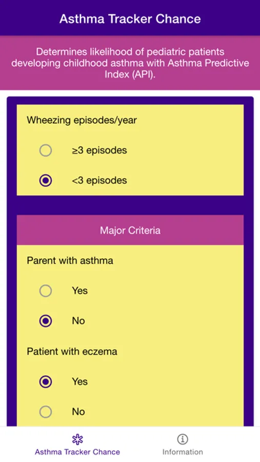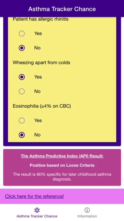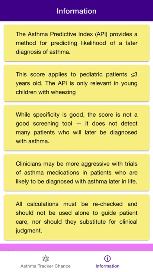 Disclaimer: all calculations must be re-checked and should not be used alone to guide patient care, nor should they substitute for clinical judgment. Calculations in "Asthma Tracker Chance - Asthma Predictive Index" app might be different with your local practice. Consult to expert doctor whenever necessary.