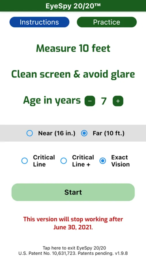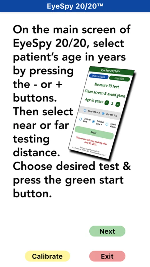 Using this application is very simple and extraordinarily fast. [1] Select the age of the patient to be tested, [2] show the device screen to the patient and ask them to slowly "read" the 3 letters from the top - down. [3] once the patient has responded with ALL THREE RESPONSES, turn the device away from the patient and tap each letter once or twice to indicate correct or incorrect answers from the patient, [4] swipe the screen from left to right and [5] repeat the process. Follow the on-screen prompts regarding testing distance and which eye to cover at specific times.