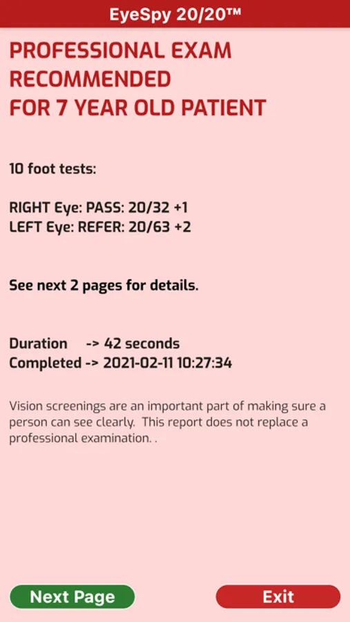 Upon completion of the assessment, the app reports visual acuity for each eye, at each test distance in both Snellen and logMar units. In addition, the system provides false positive, false negative and overall reliability scores. Should the patient prove "unreliable", the system will report that the patient is unreliable and NOT provide a visual acuity assessment.