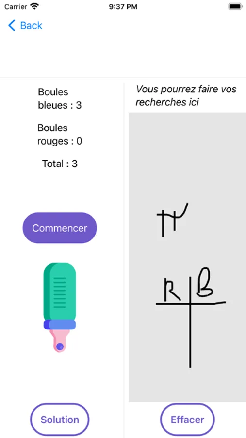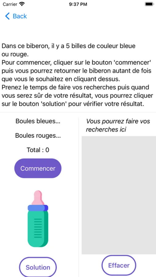 Le but est de trouver la composition d'un biberon en ne sachant que le nombre de billes qu'il contient et en ne pouvant qu'apercevoir une bille à la fois.