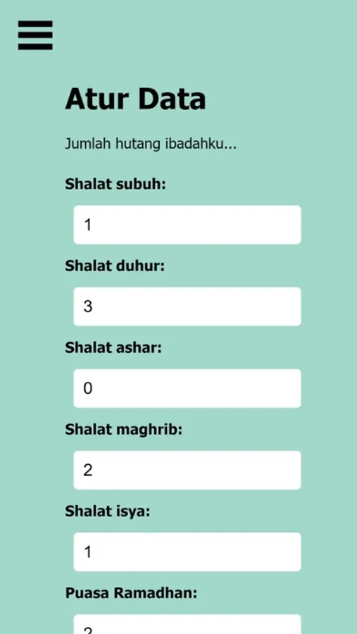 Dengan aplikasi ini kamu bisa dengan mudah mencatat hutang-hutang shalat kamu yang ketinggalan. Kalau sudah dibayar, kamu bisa tandai sehingga jelas tinggal berapa jumlah hutang shalat kamu.