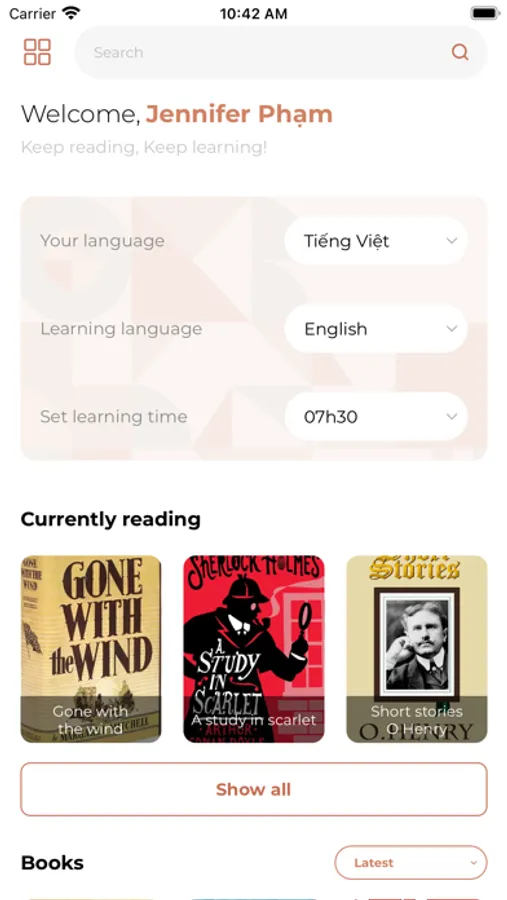 Once accomplished one language, you can move to the other by choosing a different book and / or selecting a different language pair such as English - French, French – Russian etc.