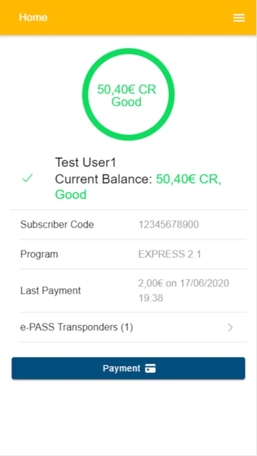 Additional summary information on the Home screen includes: the subscriber code, the Commercial policy programme that the user is subscribed to, the amount and timestamp of the last payment and the information of the Transponders-Account cards assigned to the subscribers’ Electronic Toll Collection (ETC) account.