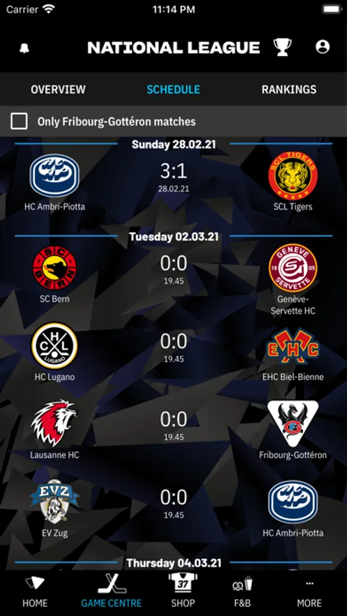 - Ein Home-Feed mit einfachem und schnellem Zugriff auf die Spielergebnisse, Nachrichten, Social-Media-Feeds und Videos von Fribourg-Gottéron.