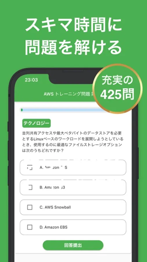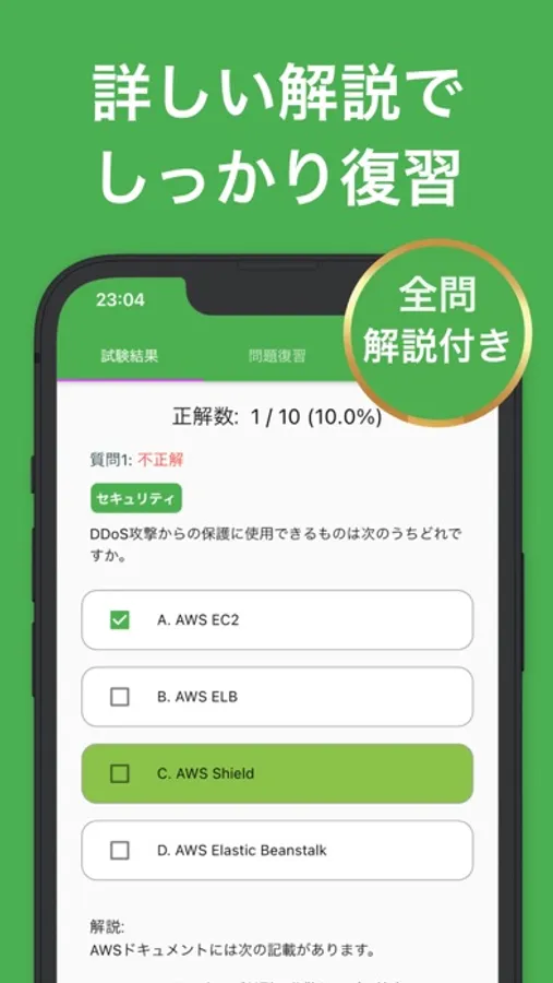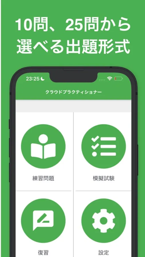 10問ごとにクラウドプラクティショナー問題に挑戦できる練習問題、本番試験同様の難易度の25問を解くことができる模擬試験を搭載しています。