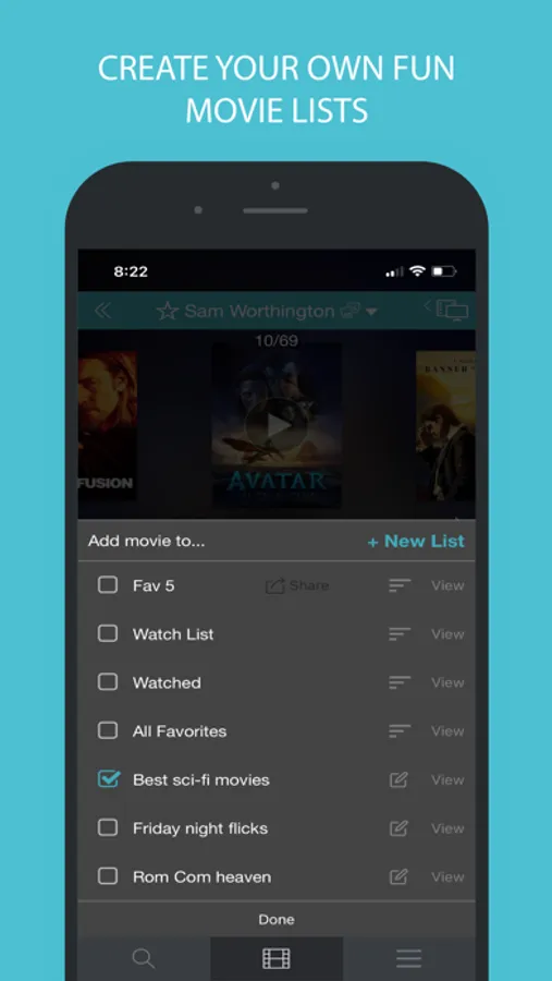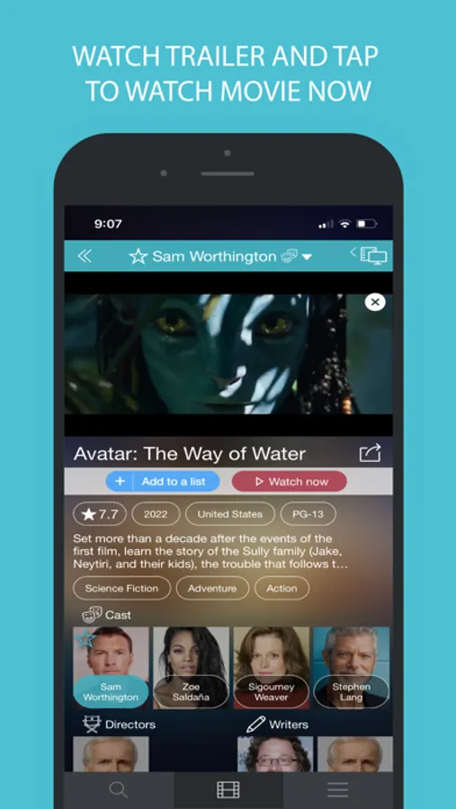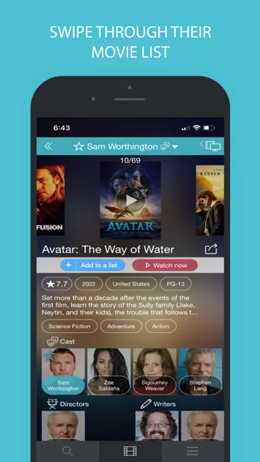 As you swipe through movie lists you can tap a new actor, writer or director at any time and switch to their movie list. Along the way, it's easy create your own fun movie lists, or tap to watch any movie or tv show instantly on streaming services.