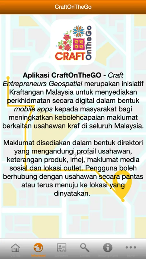 Direktori usahawan secara digital dalam bentuk aplikasi mudahalih memaparkan maklumat berkaitan Usahawan Kraftangan Malaysia yang boleh meningkatkan kebolehcapaian maklumat kepada orang awam. Maklumat disediakan dalam bentuk direktori yang mengandungi profail usahawan, keterangan produk, imej, maklumat media sosial dan lokasi outlet. Pengguna boleh berhubung dengan usahawan secara pantas atau terus menuju ke lokasi yang dinyatakan. Paparan maklumat adalah seperti di bawah: