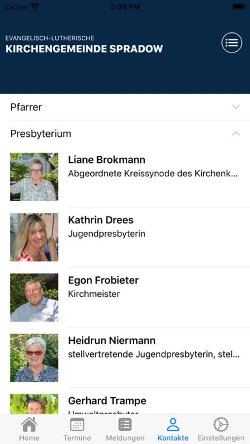 Wer Ansprechpartner sucht, findet diese unter dem Menüpunkt Kontakte. So bildet die App das gesamte Leben in der Kirchengemeinde Spradow ab.