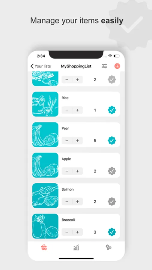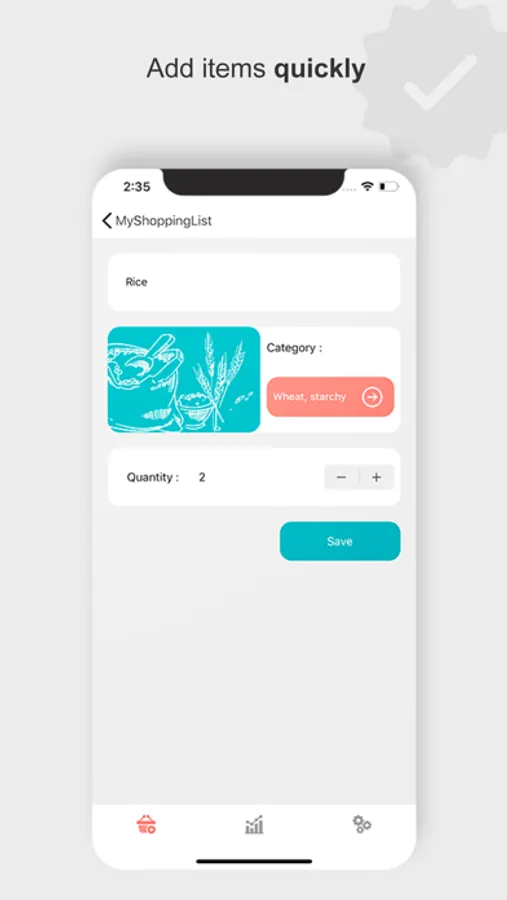 Add items quickly. Enter the name of your item, choose its category, then increase or decrease its quantity.