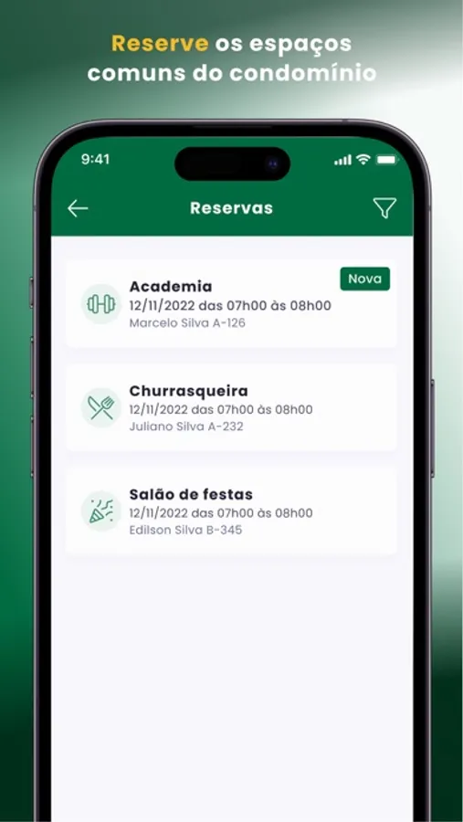 • RESERVAS: Churrasqueira, salão de festas e os demais espaços comuns do condomínio podem ser reservados em poucos cliques no aplicativo.