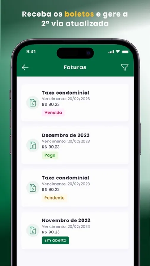 • FATURAS: Receba a taxa condominial pelo app e copie o código de barra para pagar em seu internet banking. Venceu? Sem problemas: é só gerar a 2ª via e pagar na hora.